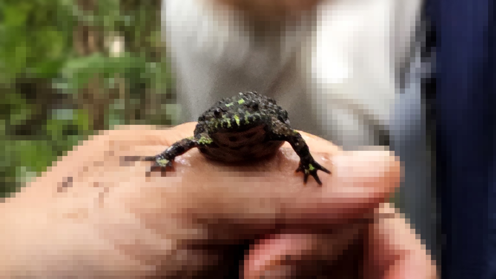 - 서로 찾은 가재를 올려 놓고 관찰해 본다. 난 작은 가재 한마리와, 붉은 무당개구리를 발견했는데, 손에 붙잡힌(물론 내손은 아니다) 무당 개구리가 화가나서 몸을 뒤집고, 흔들면서 화를 낸다. 위는 보호색으로 검푸른 색인데, 배가 빨간 것이 아주 신기했다.