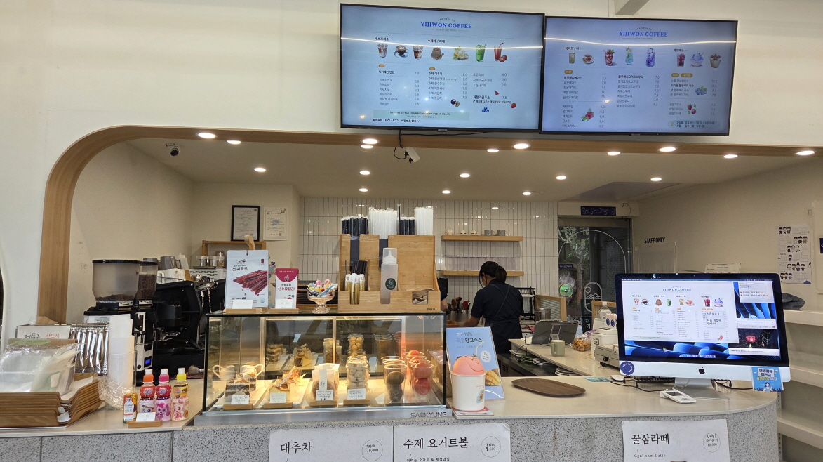 - 오른쪽 출입구 앞에 놓여져 있는 과자 판매대