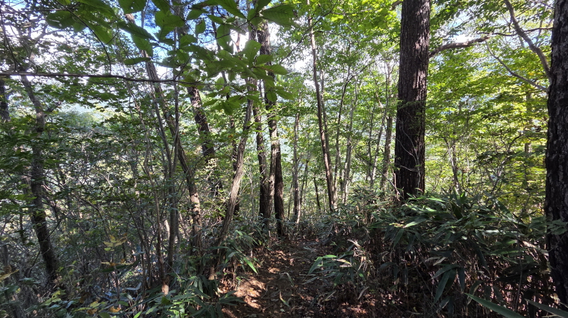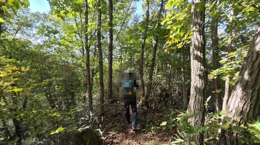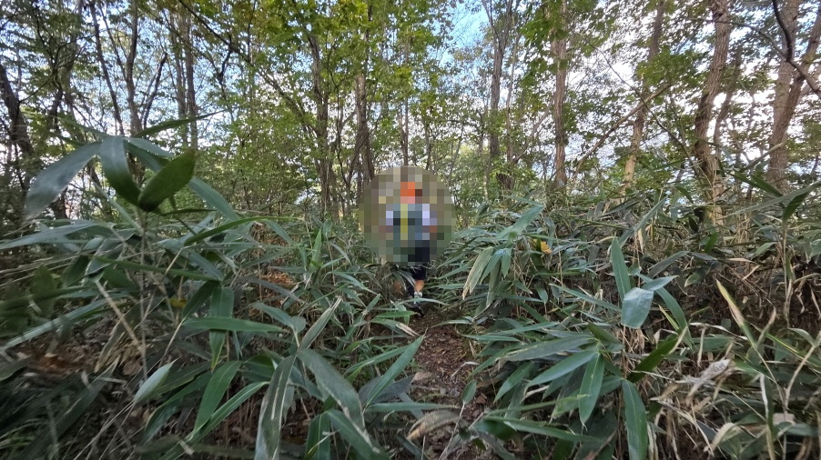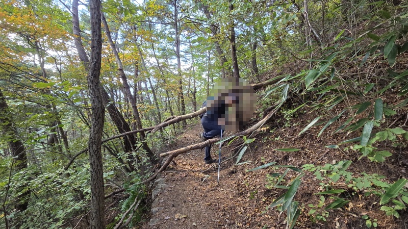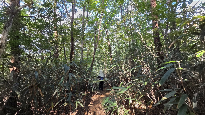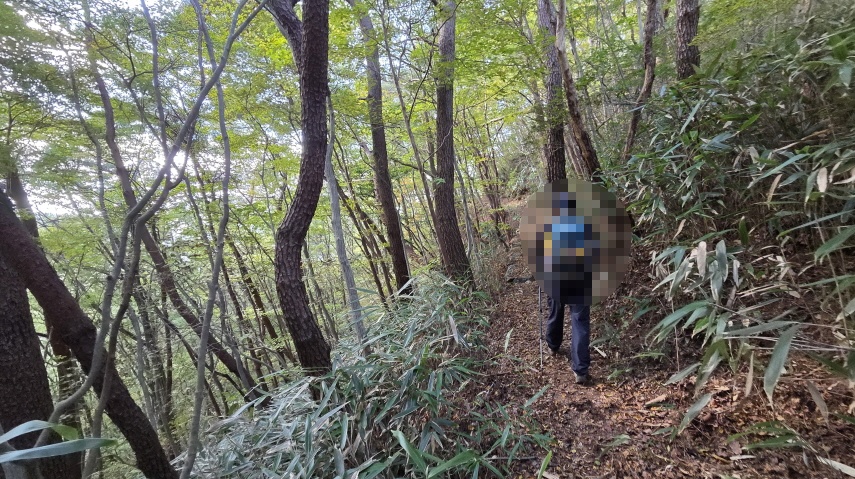 - 임도 삼거리에 들어선 숲길은 조릿대가 내 키보다 더 크게 자란 곳도 있다. 대숲길도 헤치고, 오솔길도 따라 걷다가, 급경사 하산길이 시작된다. 하산이 힘든 사람들이 속도가 느려지기 시작한다.
