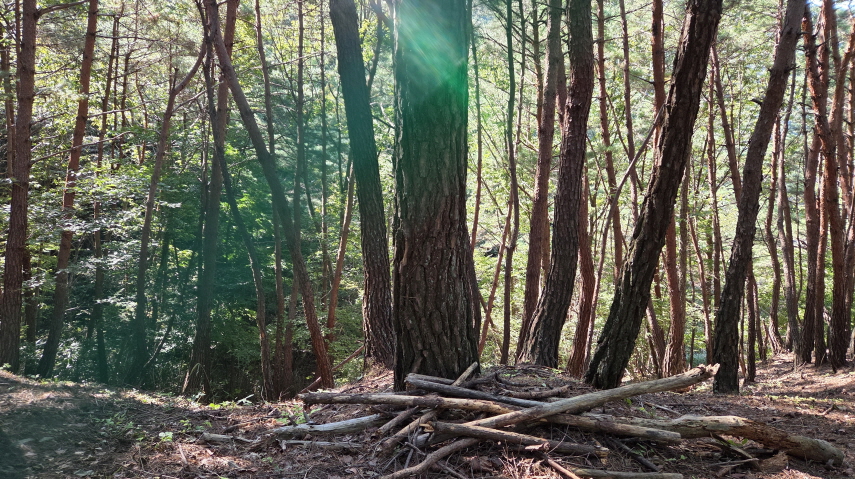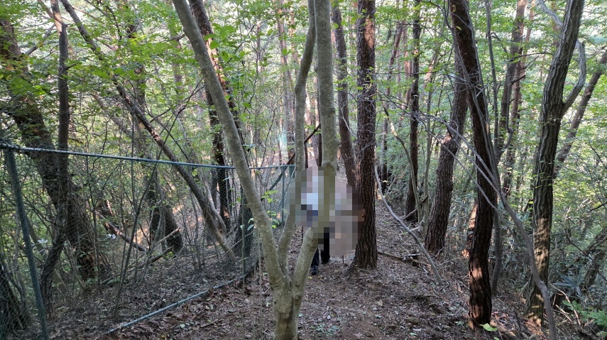 - 급경사를 어그적거리며 하산하고 보니, 왼쪽으로 철조망이 쳐있다. 소나무 군락지에서 송이를 재배하시는 분이 길을 내주기는 하나 송이를 보호하기 위해 철망을 처달라고 요구하여 친 700m 철망이라고 한다.