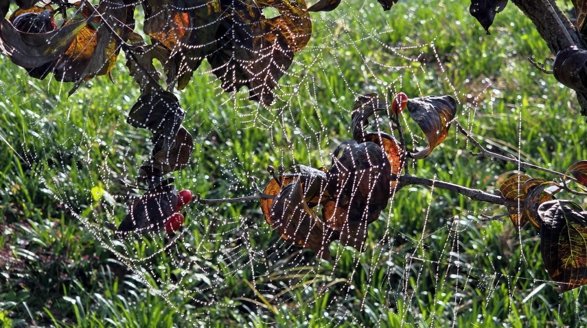 - 거미줄에 걸린 이슬방울이 채 마르지 않고, 대롱대롱 맺혀 있다. 햇빛을 받은 거미줄이 반짝인다.