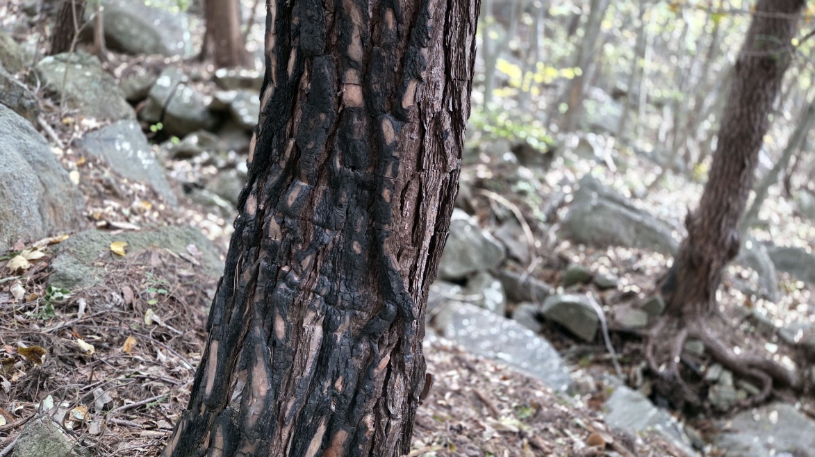 -구례에 산불이 났던 흔적이 세월이 많이 흘렀는데도 아직도 남아 있다. 새로자라난 편백나무가 이렇게 성성한데.