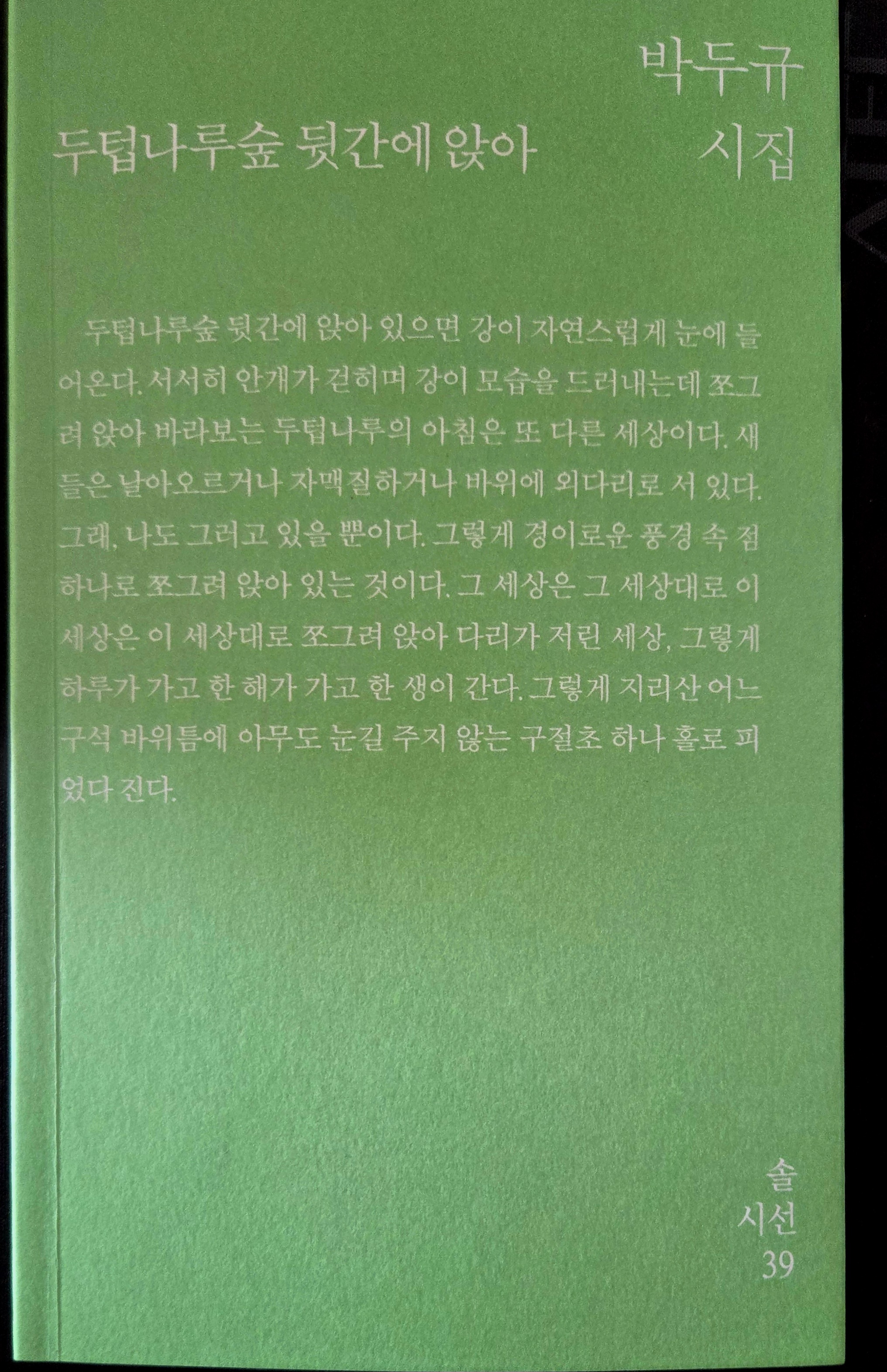 - “내 삶은 숲에 들어가기 전과 숲에 들어간 후로 나뉘었다”. 시인 박두규가 지리산과 섬진강이 만나는 ‘두텁나루숲’을 찾은 그 후. 시간의 정수를 오롯이 담아낸 시집 『두텁나루숲 뒷간에 앉아』가 출간되었다. 이 시집은 한 시인이 숲이라는 대자연 속에서 자신을 낮추고 존재의 근원을 파고드는 영적 순례의 기록이다. 시인은 ‘뒷간’이라는 가장 낮은 자리에서 우주의 질서와 생명의 비의를 발견하고, 마침내 사랑으로 완성되는 영성의 길을 펼쳐 보인다.