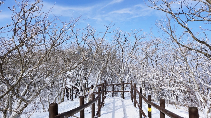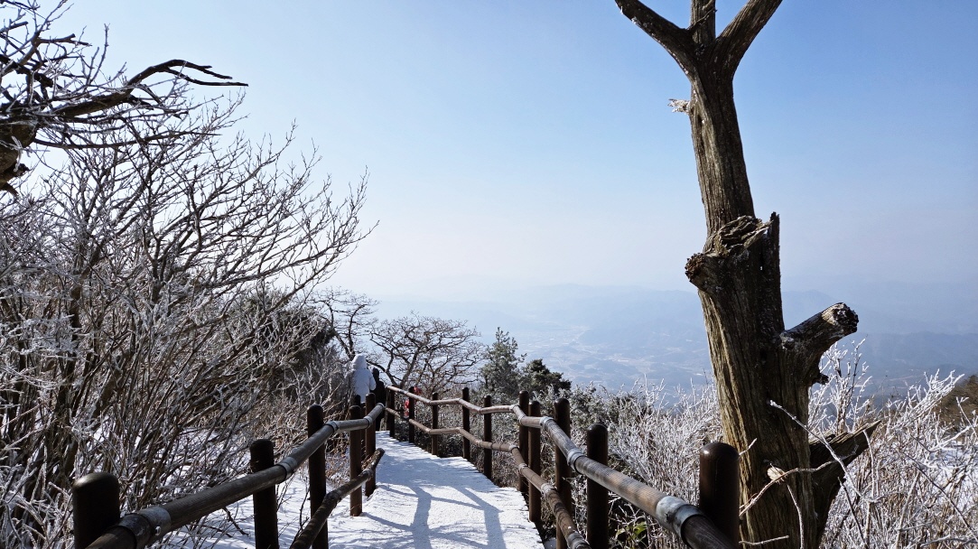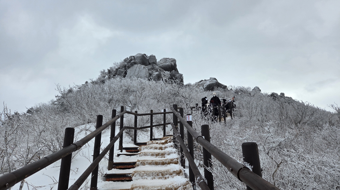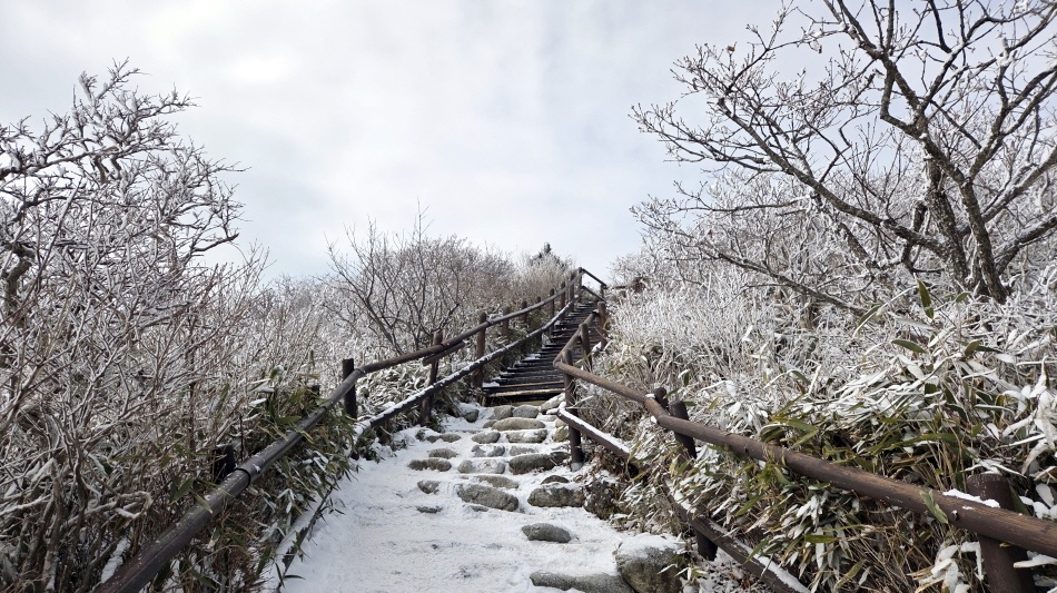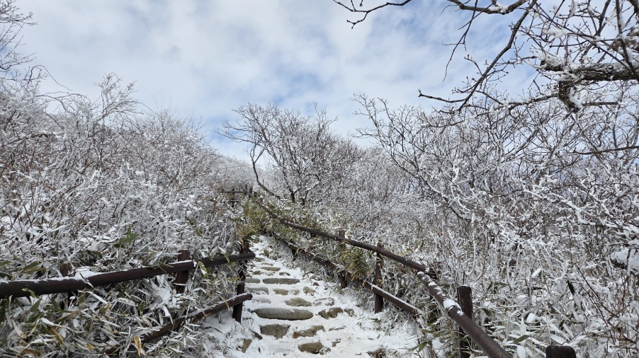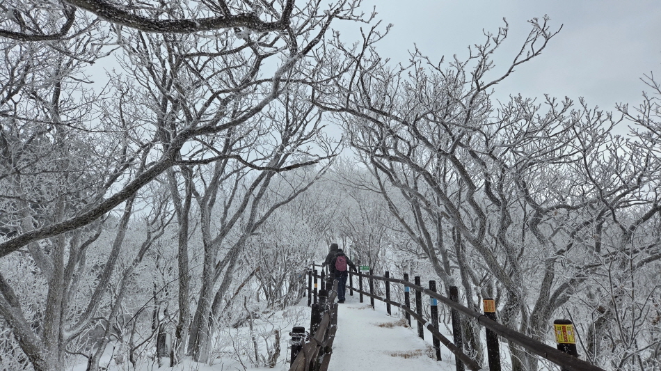 - 향적봉을 향해 올라가는 길, 양쪽의 하얀 상고대를 보며 연신 감탄사를 연발한다. 하얀 세상 속으로.