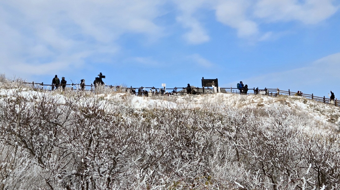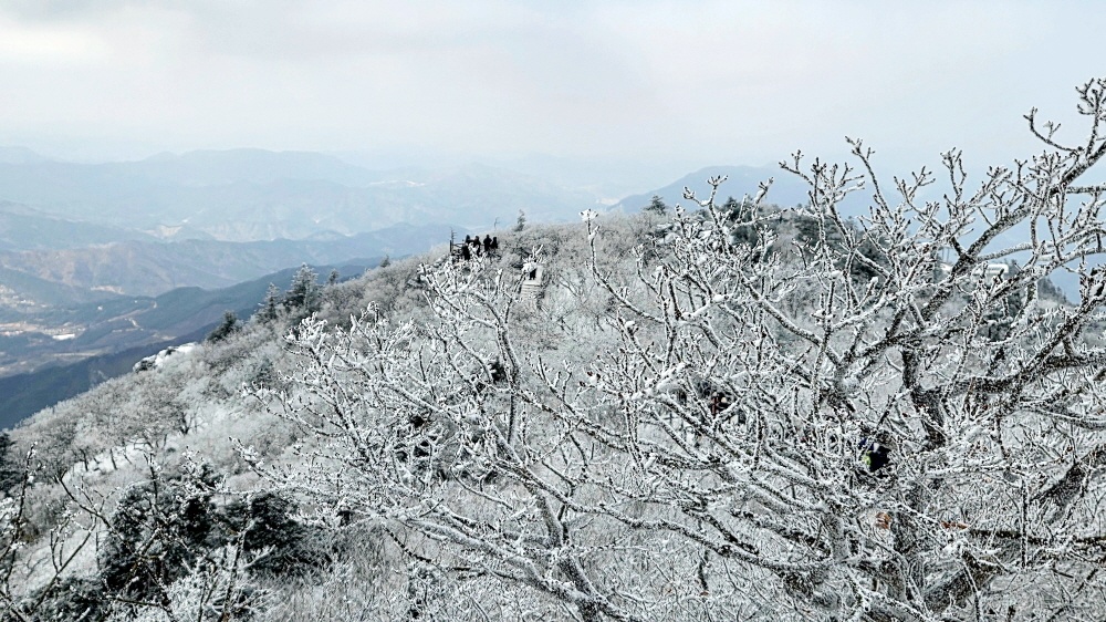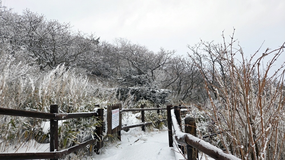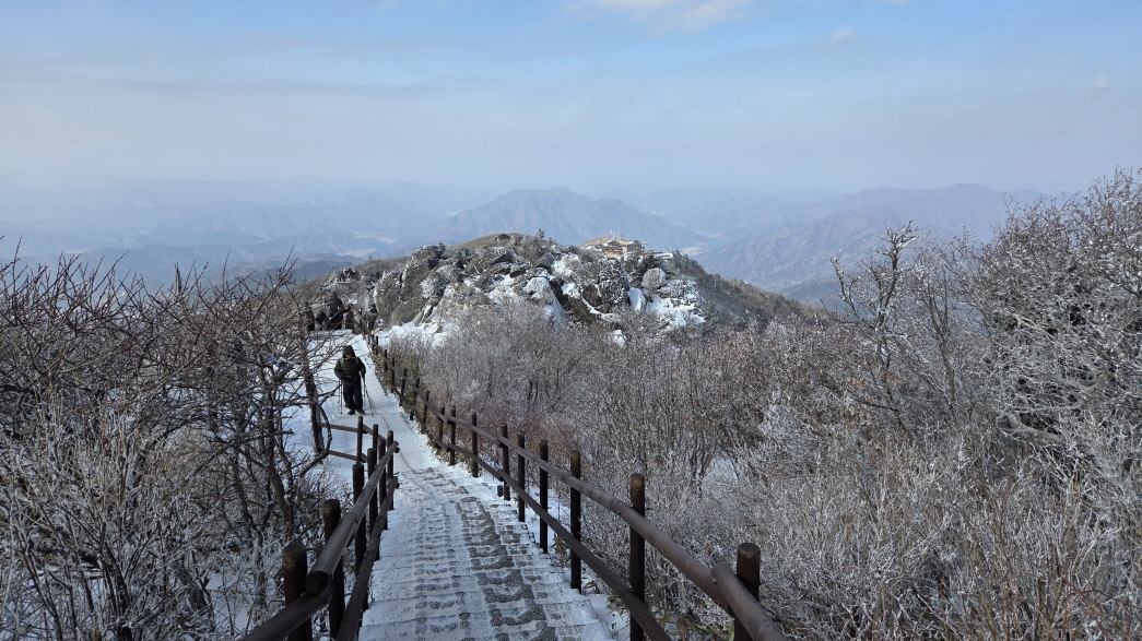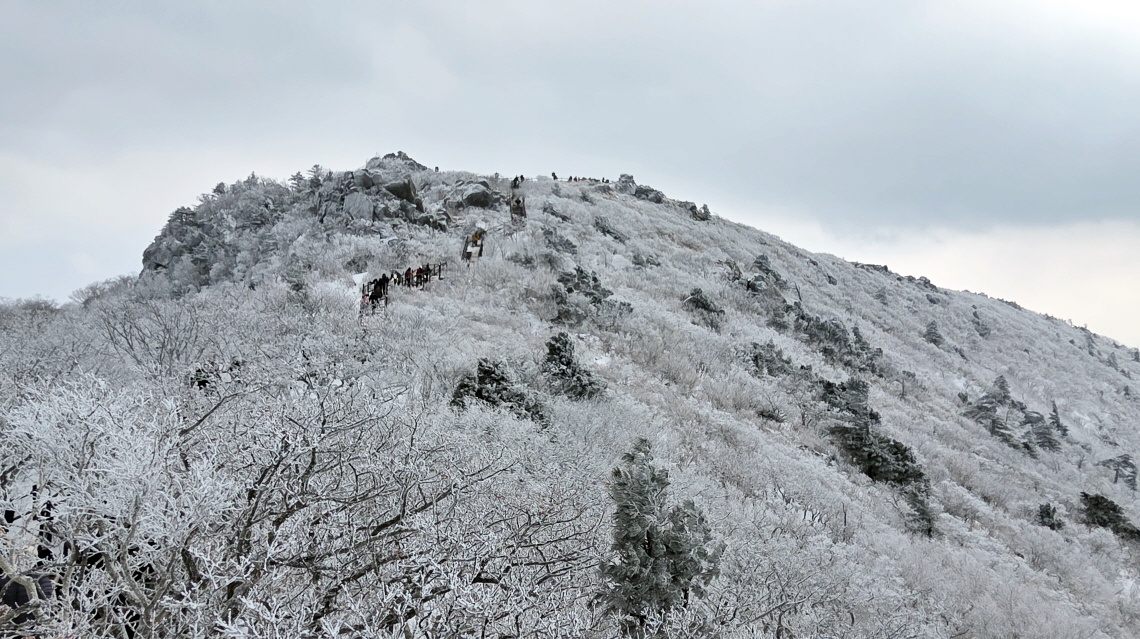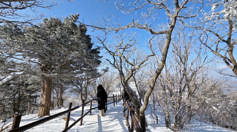- 향적봉을 향해 올라가는 길, 양쪽의 하얀 상고대를 보며 연신 감탄사를 연발한다. 하얀 세상 속으로.