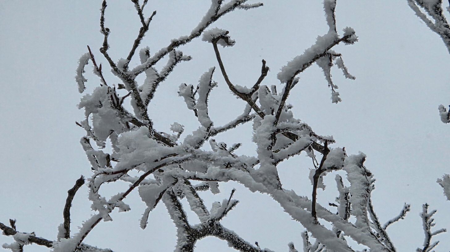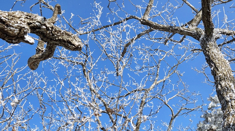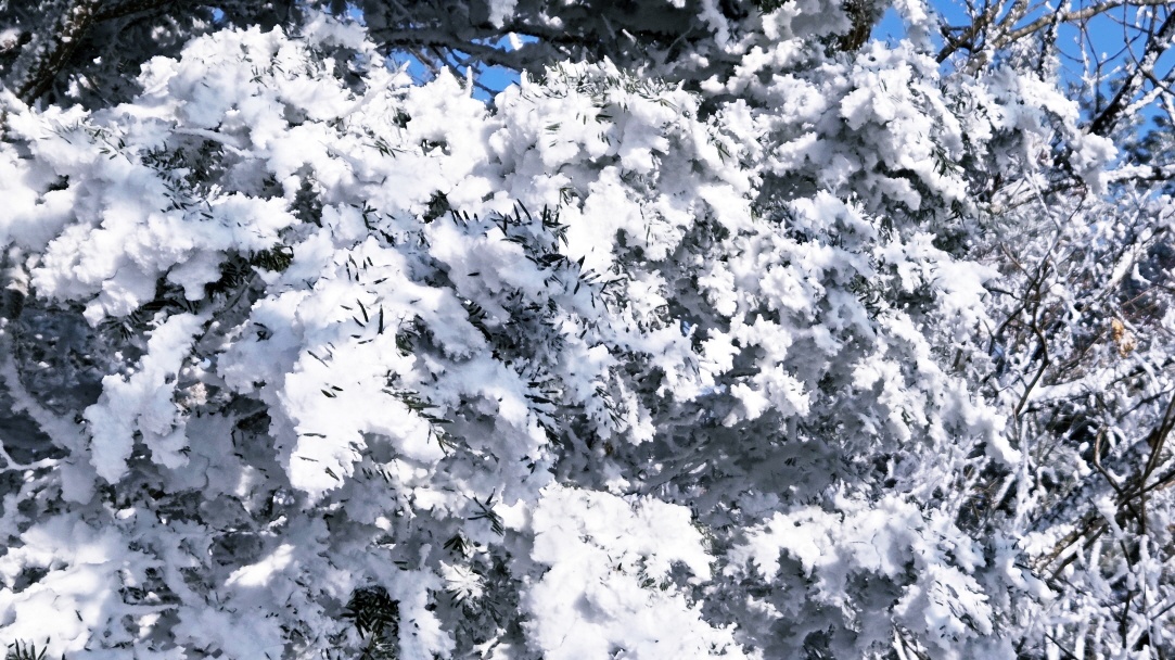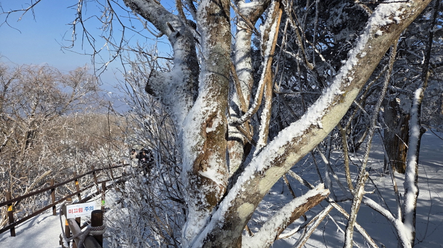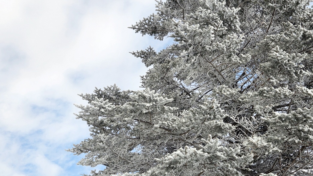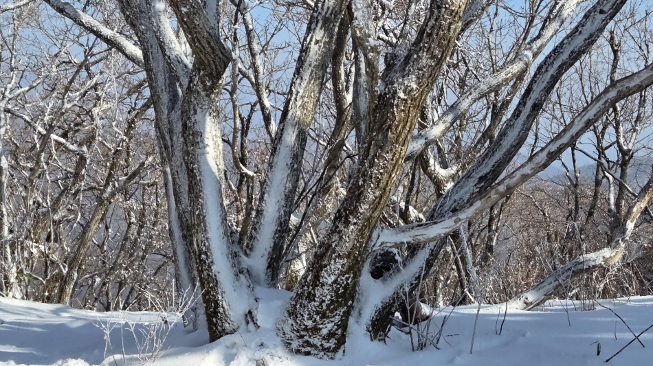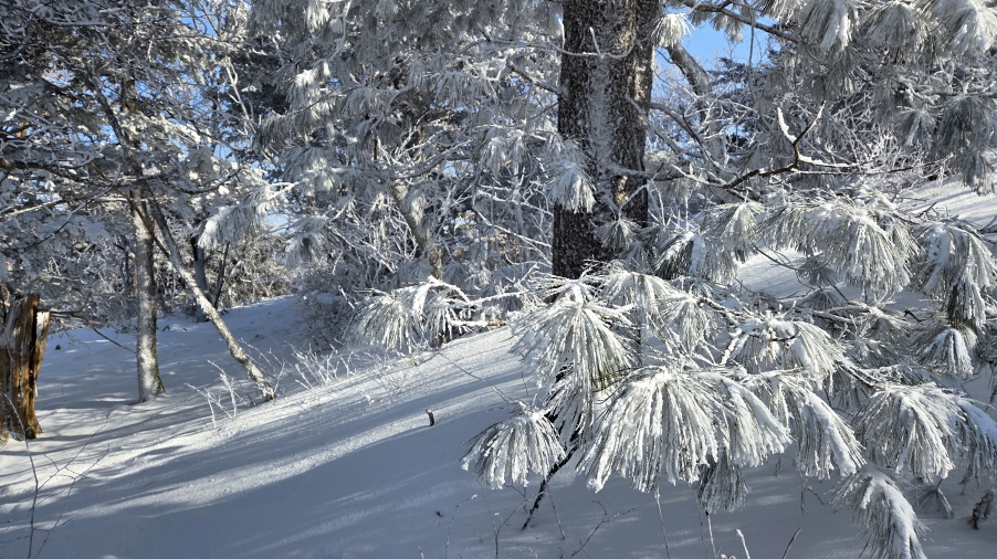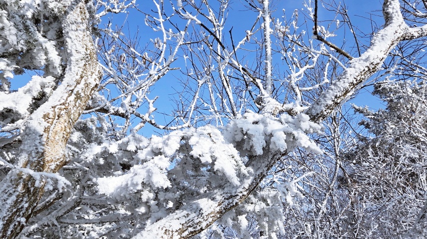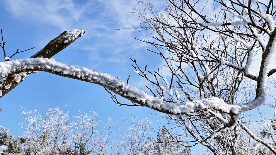 - 잿빛이었던 하늘이 밝아지면서 파란 하늘을 드러낸다. 갑자기 하얀 눈꽃들이 더욱 선명하고 아름다워 보인다. 파란색과 흰색의 조화로움.